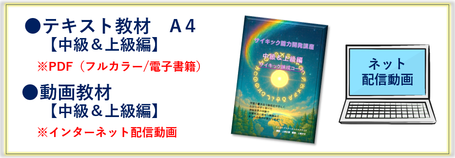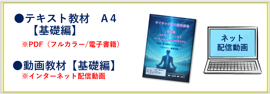 | 基礎編 サイキック入門コース ![]() | 中級&上級編 サイキック錬成コース ![]() | 基礎編&中級&上級編 サイキック完全習得コース ![]() | |